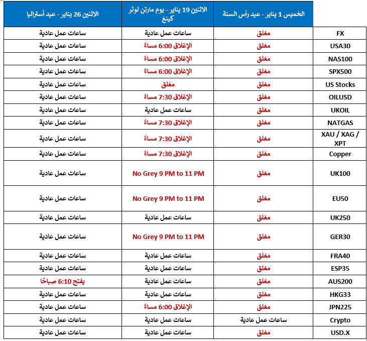 | NAS100 | إغلاق الساعة 13:00 وإعادة الفتح الساعة 18:00 |