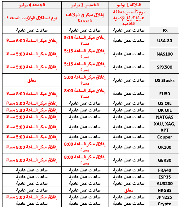 | NAS100 | ساعات عادية | إغلاق مبكر الساعة 13:00 | ساعات عادية |