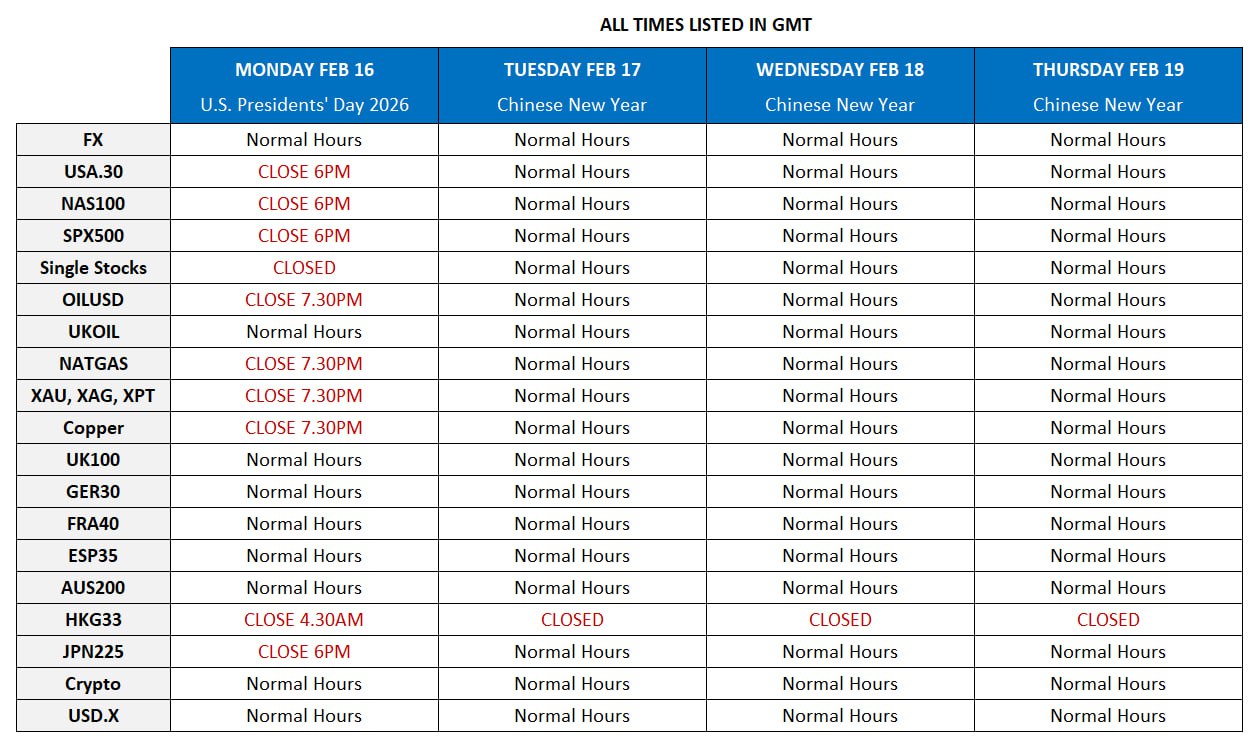 | XAU, XAG, XPT | Close 14:30 reopen 18:00 | Normal hours |